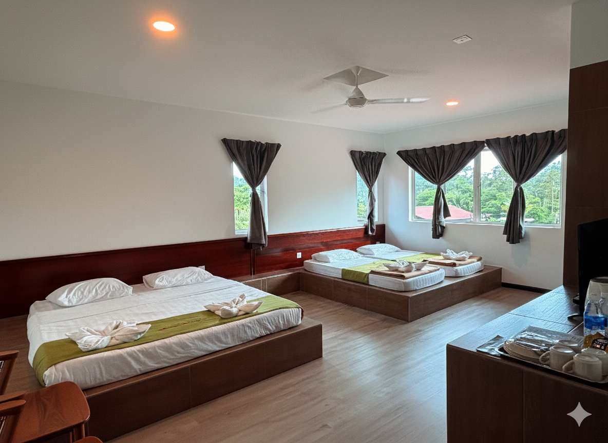 Ideal for families or small groups, the Family Room offers a spacious layout with a king-size bed and two single beds. The simple and functional design ensures convenience for everyone, with bright interiors and practical amenities to make the stay comfortable and relaxing.